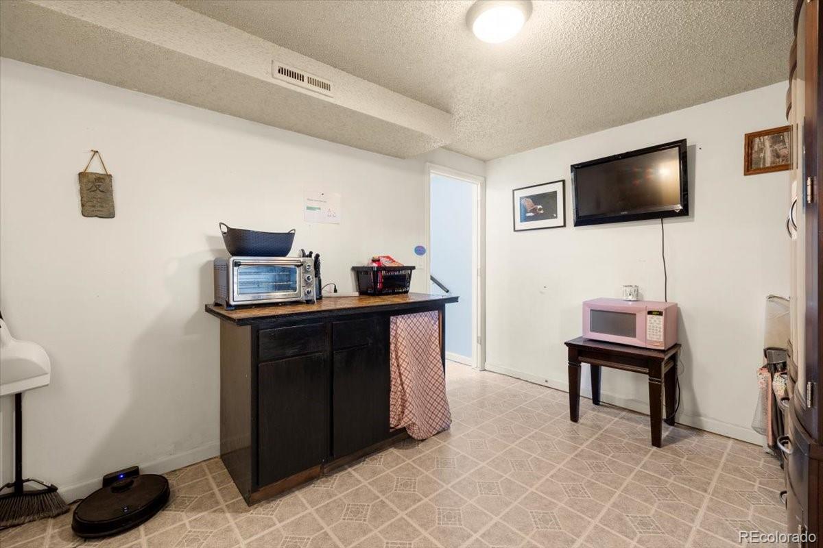 5BR, 2BA, bi-level home in the NE neighborhood of Cimarron Hills. Separate Owner's quarters on the upper level. Durable vinyl flooring through most of the home. The upper-level features a Living Rm with lighted ceiling fan, wood look vinyl floor, and slider to the backyard deck. The Kitchen offers a Dining Area with built-in storage bench. Appliances include a counter microwave, dishwasher, smooth top range oven with vent hood, and French door refrigerator. The upper-level Full Bathroom is located adjacent to the Primary Bedroom and includes a vanity, medicine cabinet mirror, and tub/shower. French doors lead into the spacious Primary BR that offers a closet and work station or private sitting area. The Lower Level features 4BRs (the garage has been converted into a 4th BR suite for extra living space) There is a Full Bathroom with vanity, framed mirror, and tiled tub shower. The washer and dryer in the Laundry Area stays. There is a TV area and Kitchenette in the Flex room. Lower-Level BRs each have a bed, desk, mini refrigerator, and TV could stay. The garage conversion makes a non conforming 6th bedroom and has carpet, sitting area, and a separate entrance for complete privacy. It can easily be converted back to a 1-car attached garage by the seller. The fenced X-Large backyard provides a deck for outdoor dining and relaxation, a brick patio with fire pit, a play set for the kids, and 2-storage sheds for tools and toys. This home is ideally located close to parks, schools, medical facilities, and the Powers Corridor for shopping, restaurants, and entertainment. Proximity to the Peterson Space Force Base & Schriever Air Force Base makes this home a great option for military personnel & their families. The lower-level of this home is currently an established air bnb, but can be converted back into a 5 bedroom home easily.
